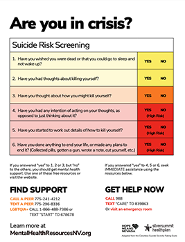 This Site is intended to provide users with general information and is not a substitute for professional advice. The information, treatment services, or other resources mentioned on this site are not an exhaustive list of all services available to a given individual for a given behavioral health problem. Nor should the provided information be interpreted as an endorsement of specific treatments or services, or any particular service provider. Hope Means Nevada, the Nevada Medical Center, Inc., its sponsors, partners, advertisers, and affiliates disclaim any liability, loss, or risk incurred as a consequence, directly or indirectly, from the use and reliance of this information.
